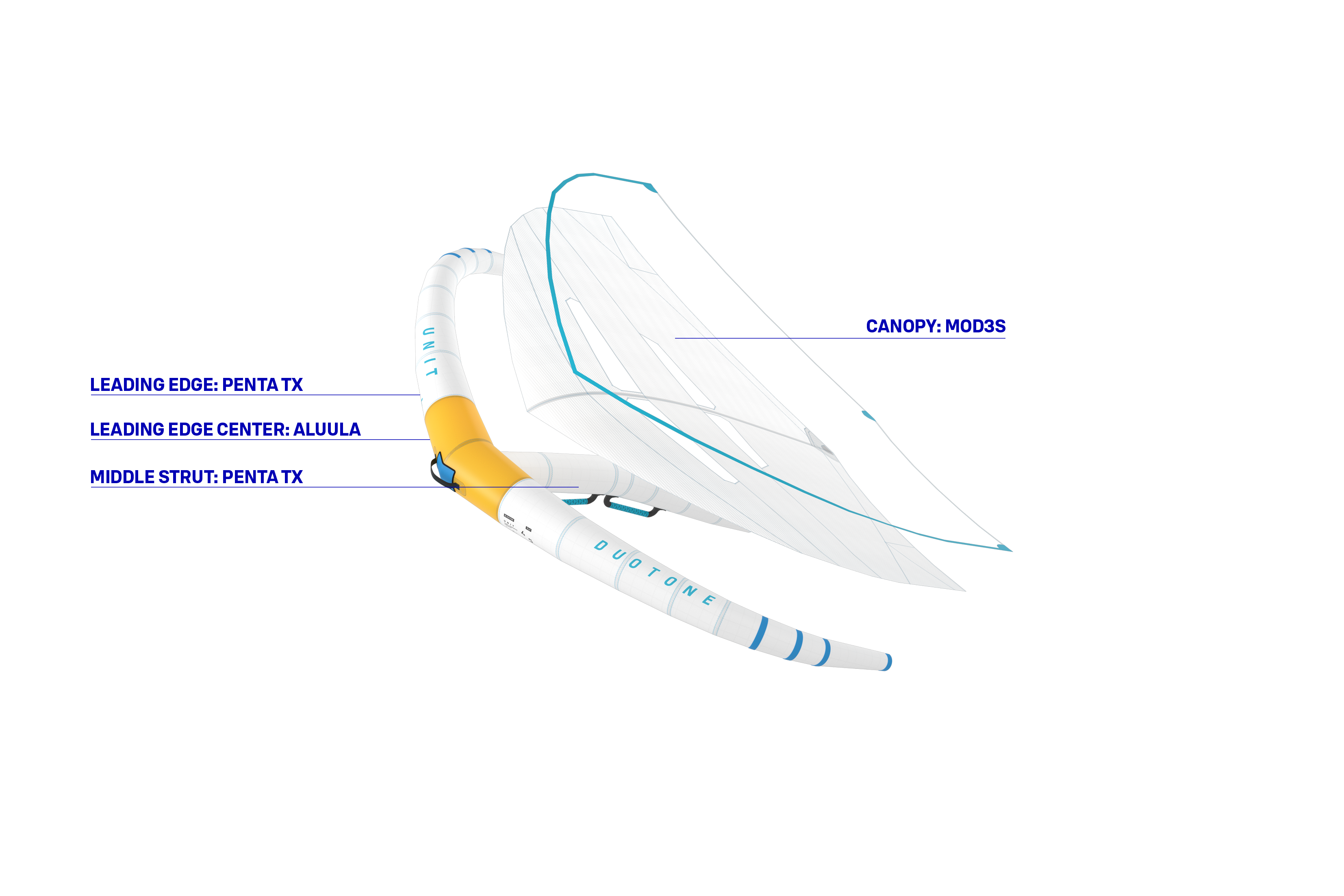 Les parties en tissu non teinté de l'aile Concept Blue comprennent le Dacron du bord d'attaque et le Middle Strut ainsi que notre MOD3 et la voilure de 50 grammes.